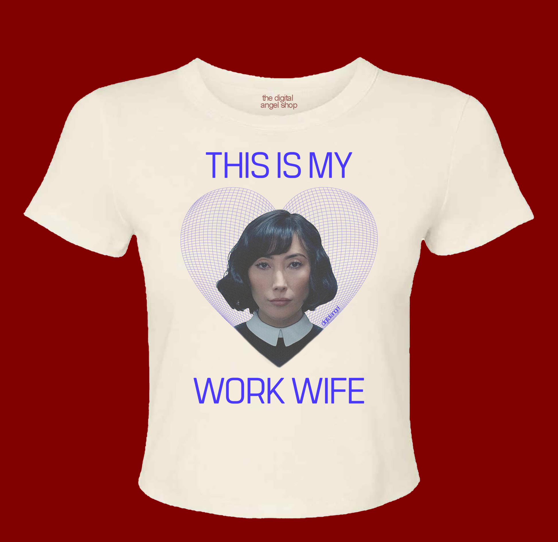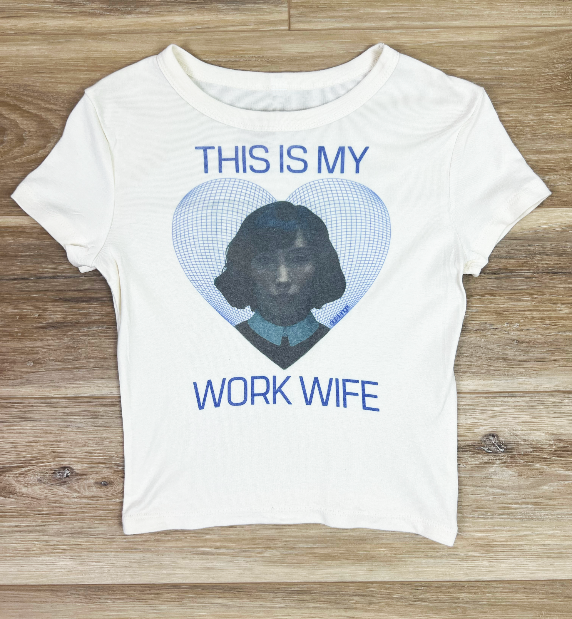 Handprinted Work Wife (Ms. Casey) Severance Baby Tee Designed in House. Printed on a beige poly cotton baby tee. Tee is printed using sublimation, a process that binds to the fabric of the shirt, giving the shirt a more vintage feel and faded graphic. Size chart is provided in last slide.